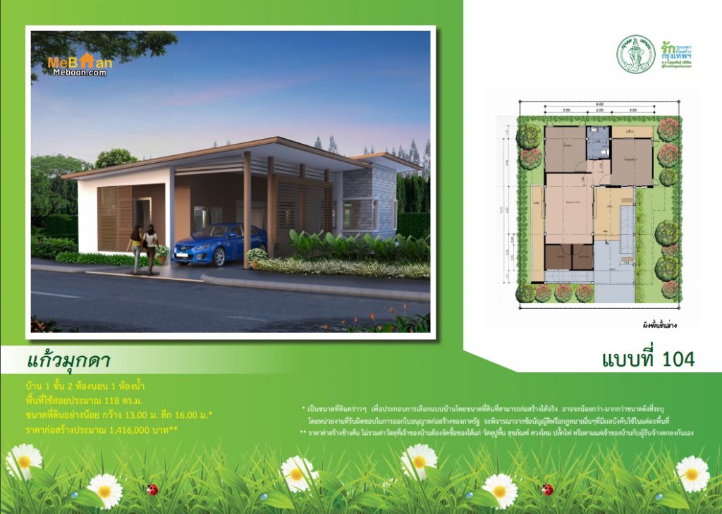 ซึ่งแบบบ้านนี้ได้ทำการแจกฟรีโดยแบบบ้านนี้จะเน้นการดีไซน์ สำหรับคนพิการและผู้สูงอายุ โดยมีทางลาดเอียงเข้าบ้าน เพื่อสะดวกต่อการเดินหรือการใช้รถเข็นวีลแชร์รายละเอียดบ้านมีดังต่อไปนี้