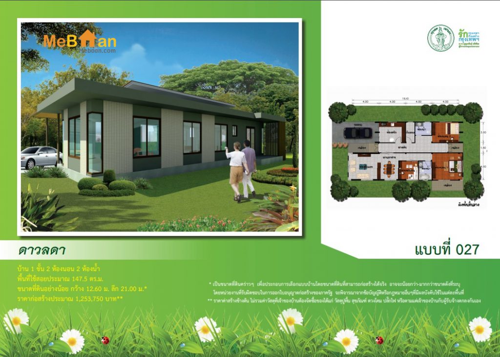 ดาวน์โหลดแบบบ้านชั้นเดียว “ดาวลดา” แบบบ้านฟรี แบบบ้านชั้นเดียวราคาไม่เกิน 1.5 ล้านบาท