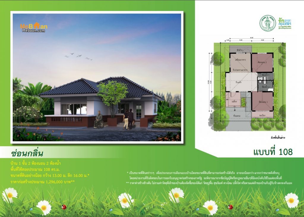 ซึ่งแบบบ้านนี้ได้ทำการแจกฟรีโดยแบบบ้านนี้จะเน้นการดีไซน์ สำหรับคนพิการและผู้สูงอายุ โดยมีทางลาดเอียงเข้าบ้าน เพื่อสะดวกต่อการเดินหรือการใช้รถเข็นวีลแชร์รายละเอียดบ้านมีดังต่อไปนี้