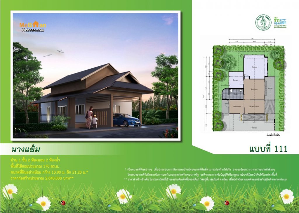 ซึ่งแบบบ้านนี้ได้ทำการแจกฟรีโดยแบบบ้านนี้จะเน้นการดีไซน์ สำหรับคนพิการและผู้สูงอายุ โดยมีทางลาดเอียงเข้าบ้าน เพื่อสะดวกต่อการเดินหรือการใช้รถเข็นวีลแชร์รายละเอียดบ้านมีดังต่อไปนี้