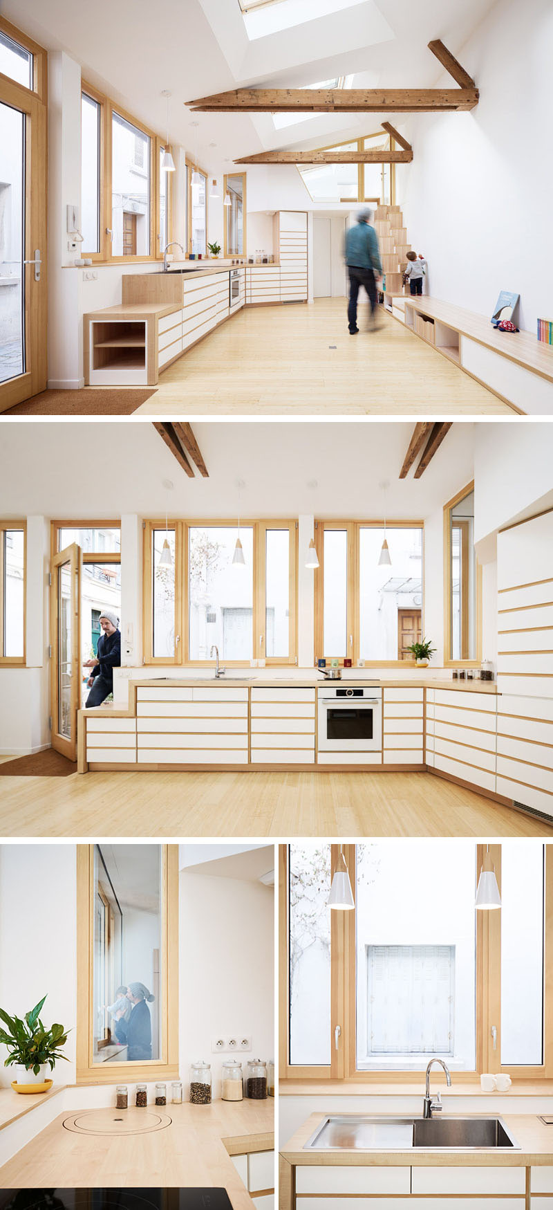 ห้องครัวออกแบบไปตามแนวของหน้าต่างและรูปทรงของห้อง มีตู้ไม้สีขาวและสอดคล้องกับโทนสีภายในโดยรวม