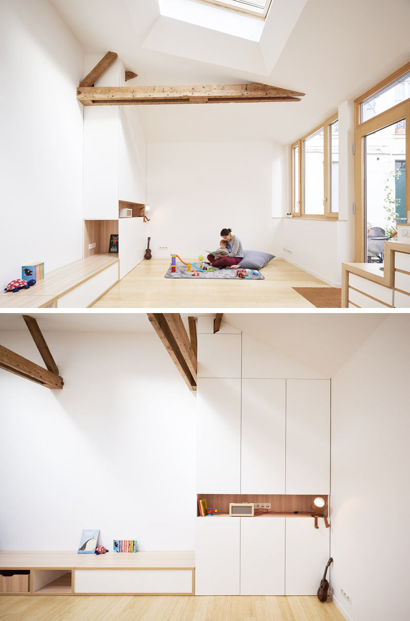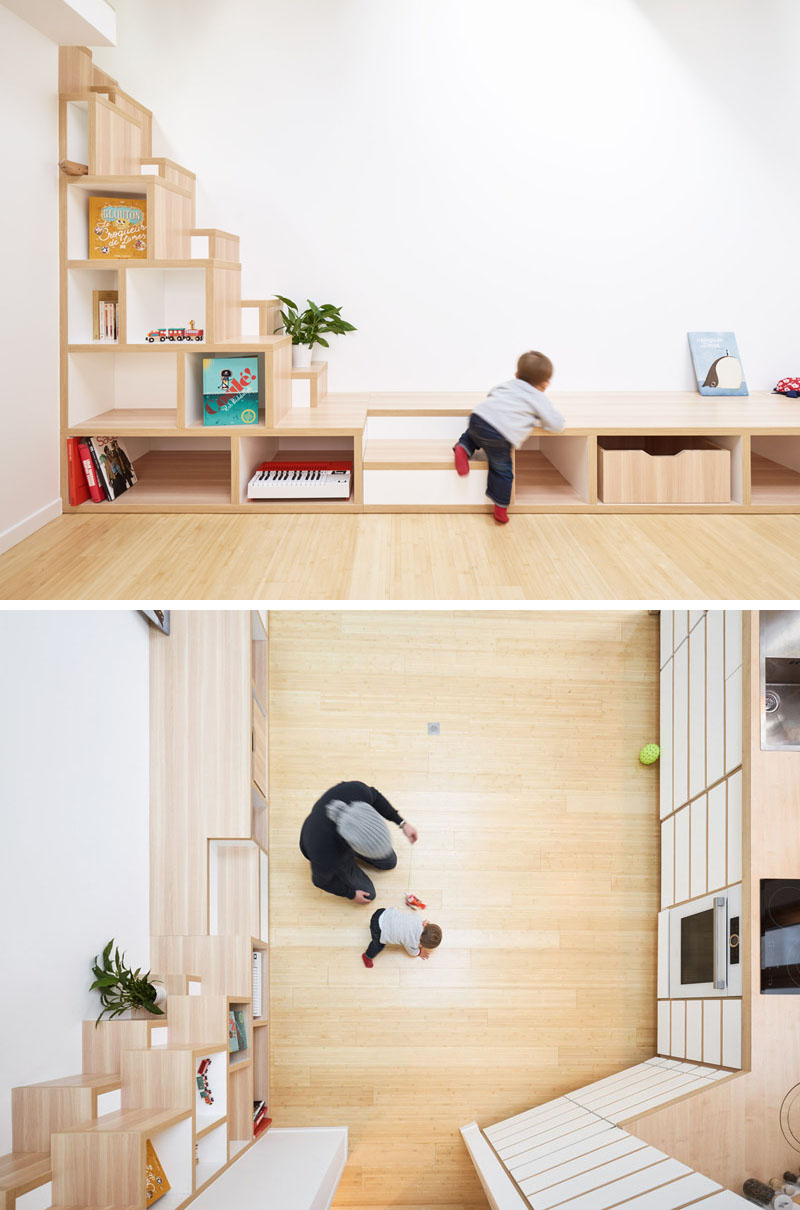 กลับเข้ามาในพื้นที่ใช้สอยหลัก มีบันไดแคบๆ มีชั้นวางของแบบเปิดได้เพื่อขี้นไปบนห้องใต้หลังคา
