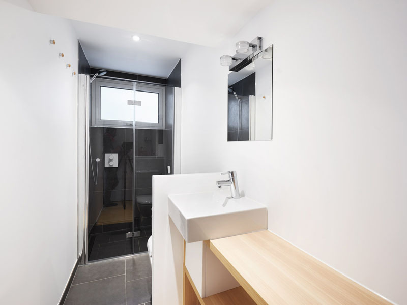 ออกไปที่ด้านข้างของห้องนอน ก็คือห้องน้ำเล็กๆ มีฝักบัวอาบน้ำ กระจกล้อมรอบและกระเบื้องสีเข้มและผนังกั้นส่วนเล็กๆ แยกพื้นที่ระหว่างโต๊ะกับห้องน้ำ
