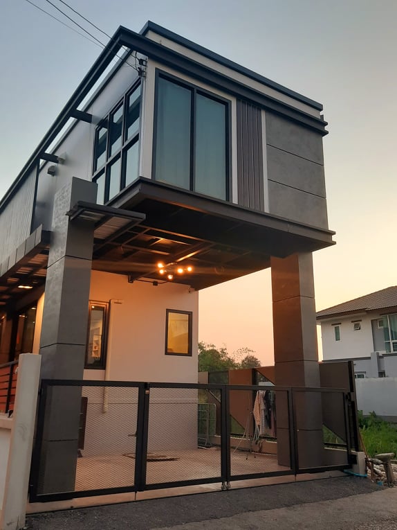 สำหรับบ้านหลังนี้จะมาในรูปแบบของบ้านโคงเหล็ก 2 ชั้น สไตล์โมเดิร์น ซึ่งเป็นบ้านที่มีความสวยงามเอามาก ๆ โดยเขาจะไม่ใช้หลังคาที่เป็นทรงจั่วเหมือนกับบ้านทรงไทยในปัจจุบัน แต่จะใช้เป็นรูปแบบของงานคอนกรีตในสไตล์โมเดิร์นที่ไม่ต้องใช้หลังคาเลยนั่นเอง และตกแต่งรอบบ้านโครงเหล็กต่าง ๆ ช่วยเพิ่มความสวยงามให้กับตัวบ้านได้เป็นอย่างดี อีกทั้งบริเวณของหน้าบ้านนั้นก็ยังมีพื้นที่กว้างขวางสามารถจอดรถได้สบาย ๆ เลย