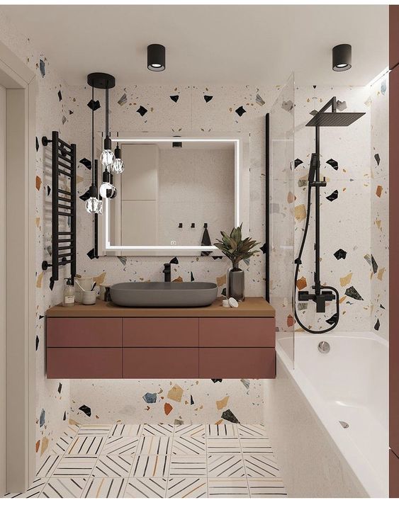 สำหรับบ้านไหนที่อยากได้ห้องน้ำที่เป็นสีโทนขาวดำนั้น ก็ลองเลือกลายกระเบื้องแบบนี้ดูได้เลยค่ะ ซึ่งก็จะมาในรูปแบบของกระเบื้องลายหกเหลี่ยมที่เข้ามุมกันได้อย่างพอดิบพอดี อีกทั้งยังเป็นห้องน้ำที่เป็นโทนสีดำซึ่งก็สามารถที่จะเข้ากับสุขภัณฑ์ต่าง ๆ ที่เป็นสีขาวได้อย่างลงตัวมาก ๆ เลยทีเดียว