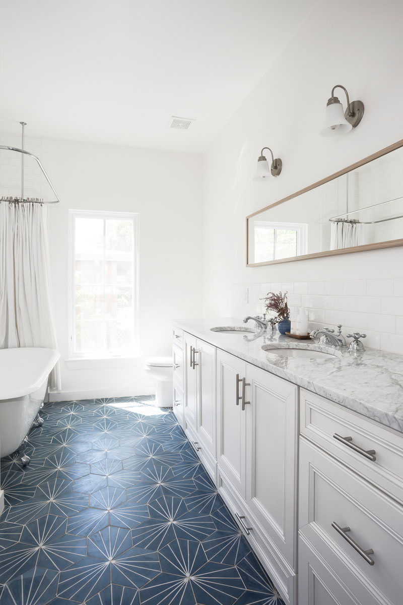 ภายในห้องน้ำแห่งที่สอง, พื้นห้องน้ำใช้กระเบื้องดอกแดนดิไลสีฟ้าเพิ่มความเด่นของสีไปกับห้องน้ำสีขาว