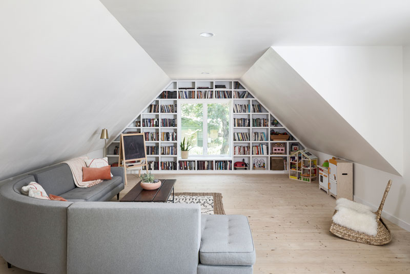 ชั้นบนมีพื้นที่ห้องนั่งเล่นแห่งที่สอง พร้อมด้วยชั้นหนังสือที่ออกแบบเองล้อมรอบหน้าต่าง
