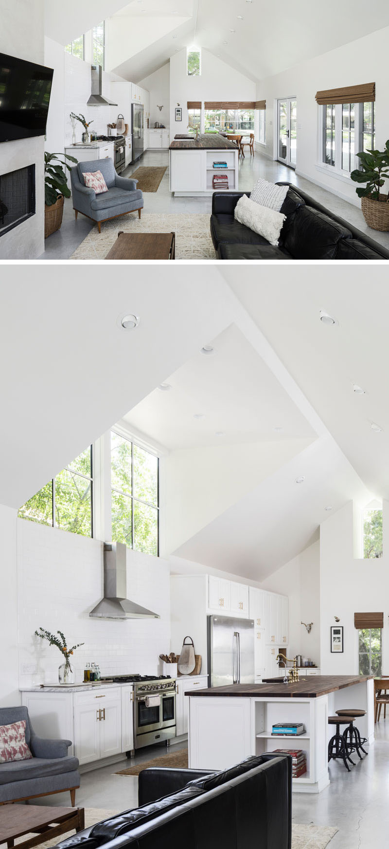 พื้นที่ห้องนั่งเล่น ห้องรับประทานอาหารและห้องครัวทั้งหมดมีพื้นที่เปิดโล่งเหมือนกันกับฝ้าเพดาน ห้องถูกเติมเต็มไปด้วยแสงธรรมชาติจากหน้าต่างบานใหญ่ที่สามารถมองออกไปยังสนามหลังบ้าน