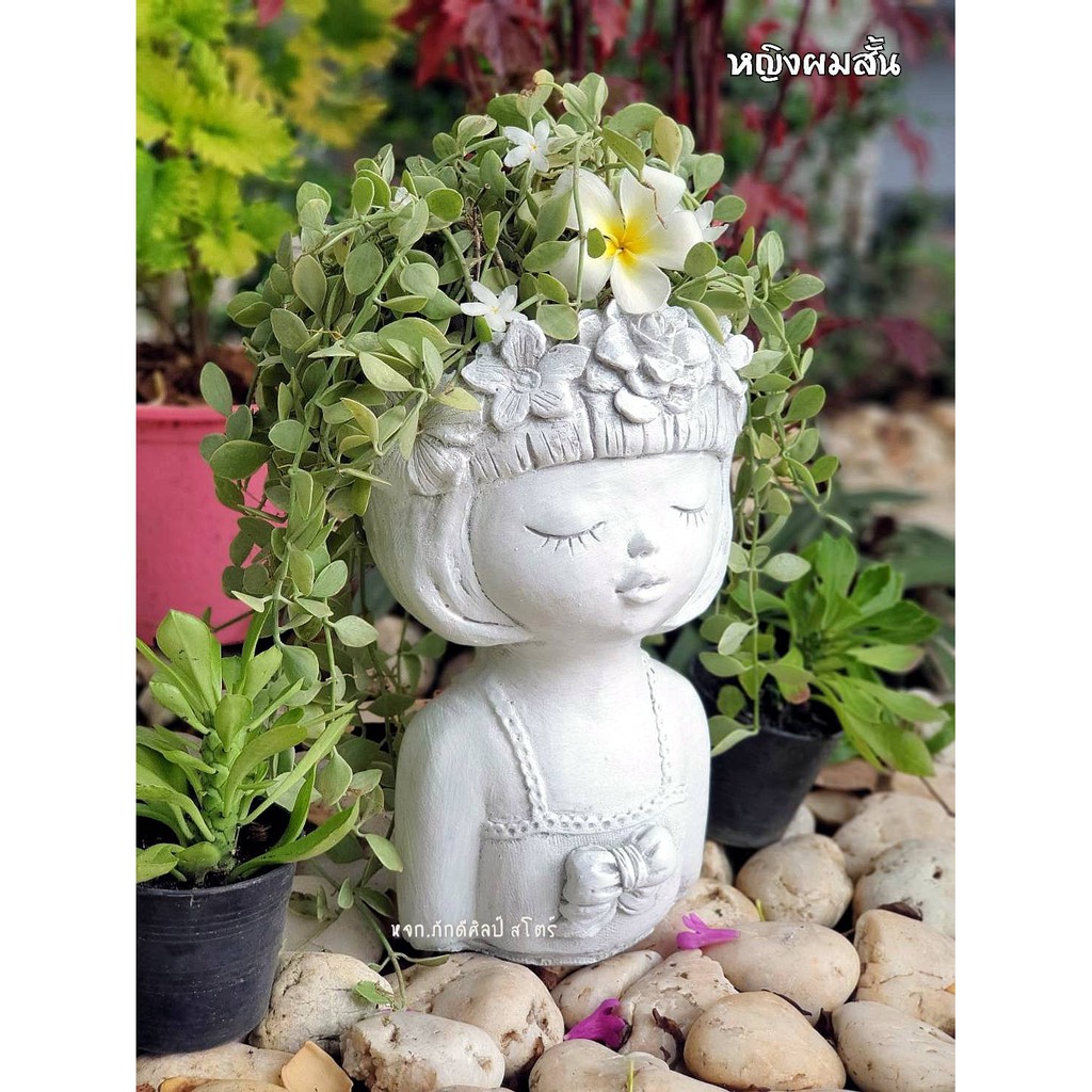 สำหรับปูนปั้นแบบนี้นั้นก็จะมีความคล้ายคลึงกับแบบเมื่อครู่ค่ะ แต่จะเป็นรูปแบบของเด็กผู้หญิงที่กำลังจับเปียอยู่ และยังมีพื้นที่บริเวณหมวกที่ให้สำหรับการปลูกต้นไม้เล็ก ๆ ได้เช่นเดียวกัน ซึ่งหากเป็นพันธุ์ไม้เลื้อยเช่นเดียวกับแบบเมื่อครู่ก็จะทำให้เกิดความสวยงามได้เป็นอย่างมากอีกด้วยค่ะ