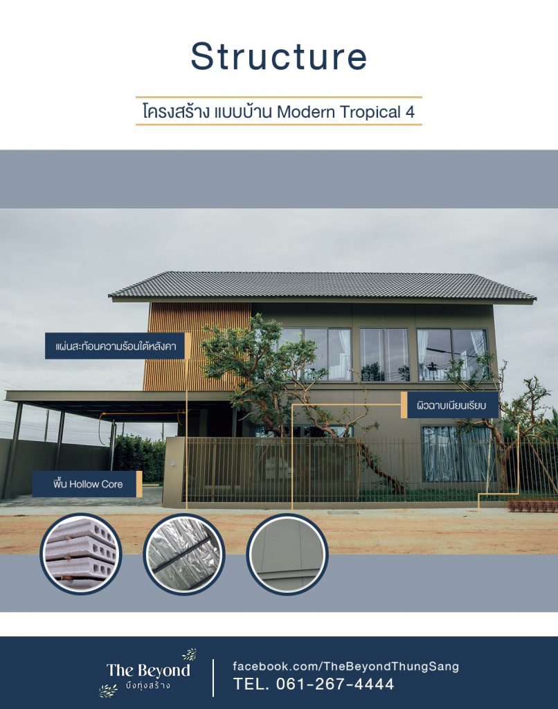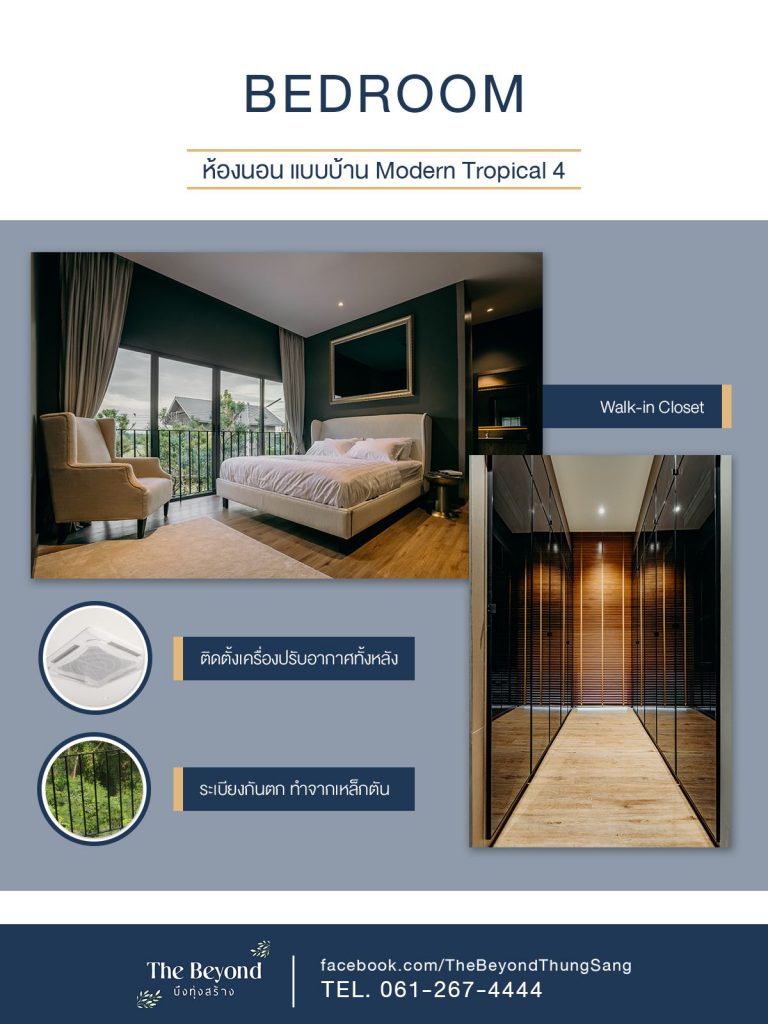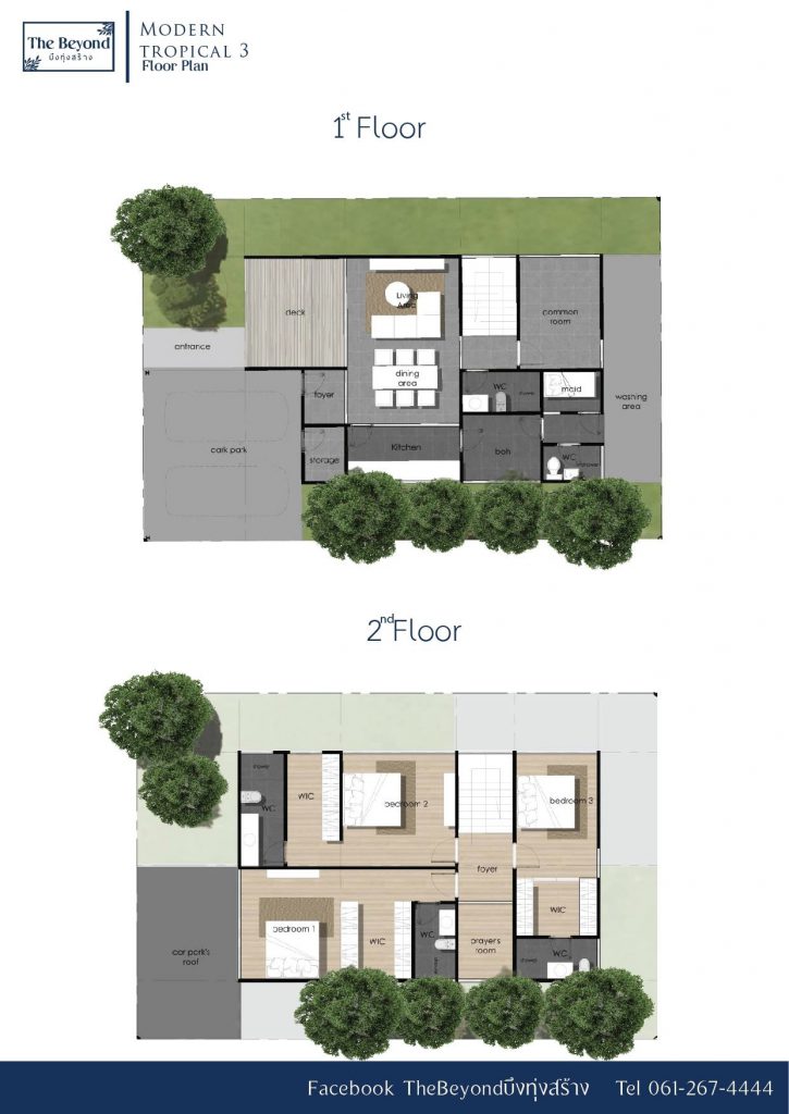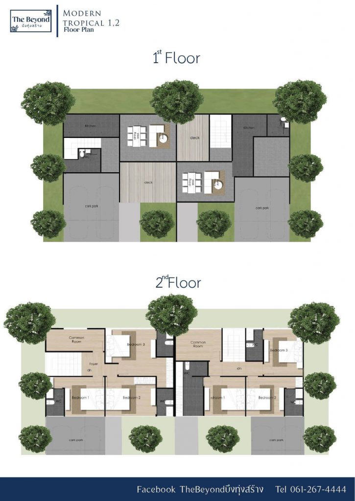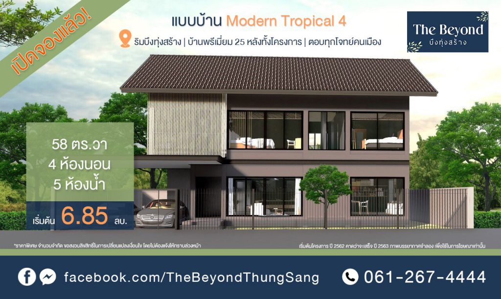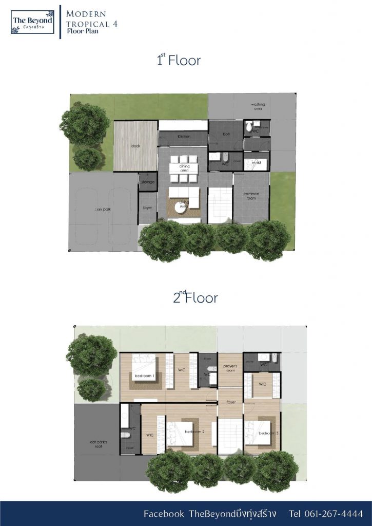Modern Tropical 3,4 พื้นที่ 57 ตารางวา ราคาเริ่มต้น 6.99 ล้านบ้าน พื้นที่ใช้สอย 230 ตารางเมตร (เป็นบ้านแฝด) 4 ห้องนอน 5 ห้องน้ำ ห้องทำงาน ห้องรับแขก ห้องพระ ห้องเก็บของ ห้องซักล้าง และห้องแม่บ้าน ที่จอดรถ 2 คัน