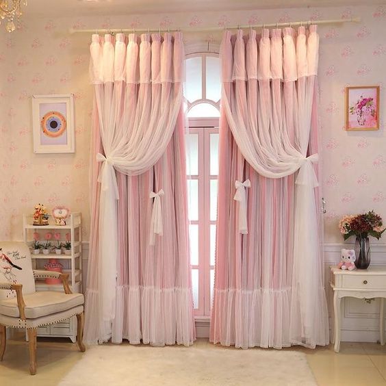 ผ้าม่านลายนี้จะมีการออกแบบเป็น 2 เลเยอร์ โดยจะใช้ชิ้นส่วนของผ้าข้างในเป็นสีเข้มและใช้ผ้าสีขาวบาง ๆ มาตัดกับสีอีกที ตกแต่งด้วยตัวเก็บผ้าม่านแบบผูกโบว์ที่น่ารักเอามาก ๆ ให้ความรู้สึกเหมือนกับอยู่ในห้องนอนของเจ้าหญิงในการ์ตูนที่ได้เคยดูมาเลยทีเดียว